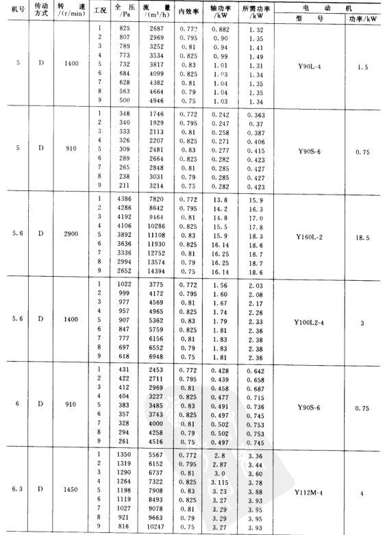 1)本風機為單吸入風機,機號有No.3.15、3.55、4、4.5、5、5.6、6.3、7.1、8、9、10、11.2、12.5、14等共14個機號組成。